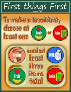 The overall subhead for the "FIRST THINGS FIRST" campaign is "BREAKFAST @ SCHOOL FOR FIRST CLASS LEARNING!" -- this subhead is meant to refer to ANY KIND of breakfast program, no matter what serving arrangements you may have. If you have a specialized program at some or all schools, you can choose from two other subheads: "BREAKFAST IN THE CLASSROOM FOR FIRST CLASS LEARNING!" OR "GRAB 'N' GO BREAKFAST FOR FIRST CLASS LEARNING!"